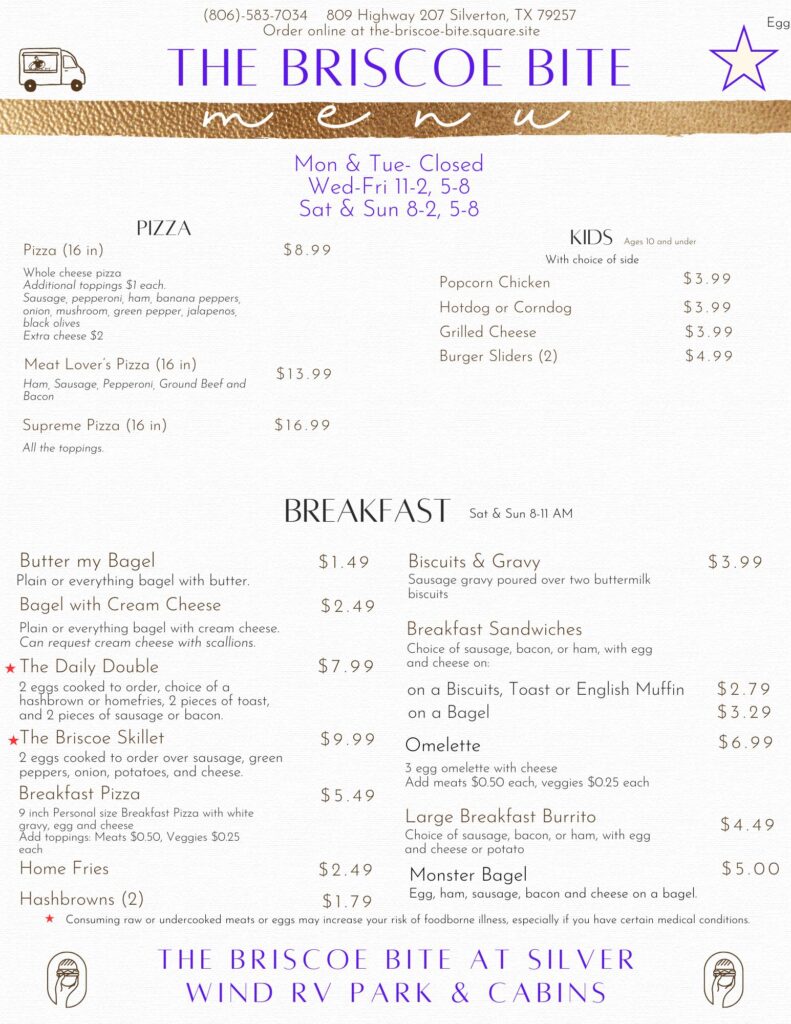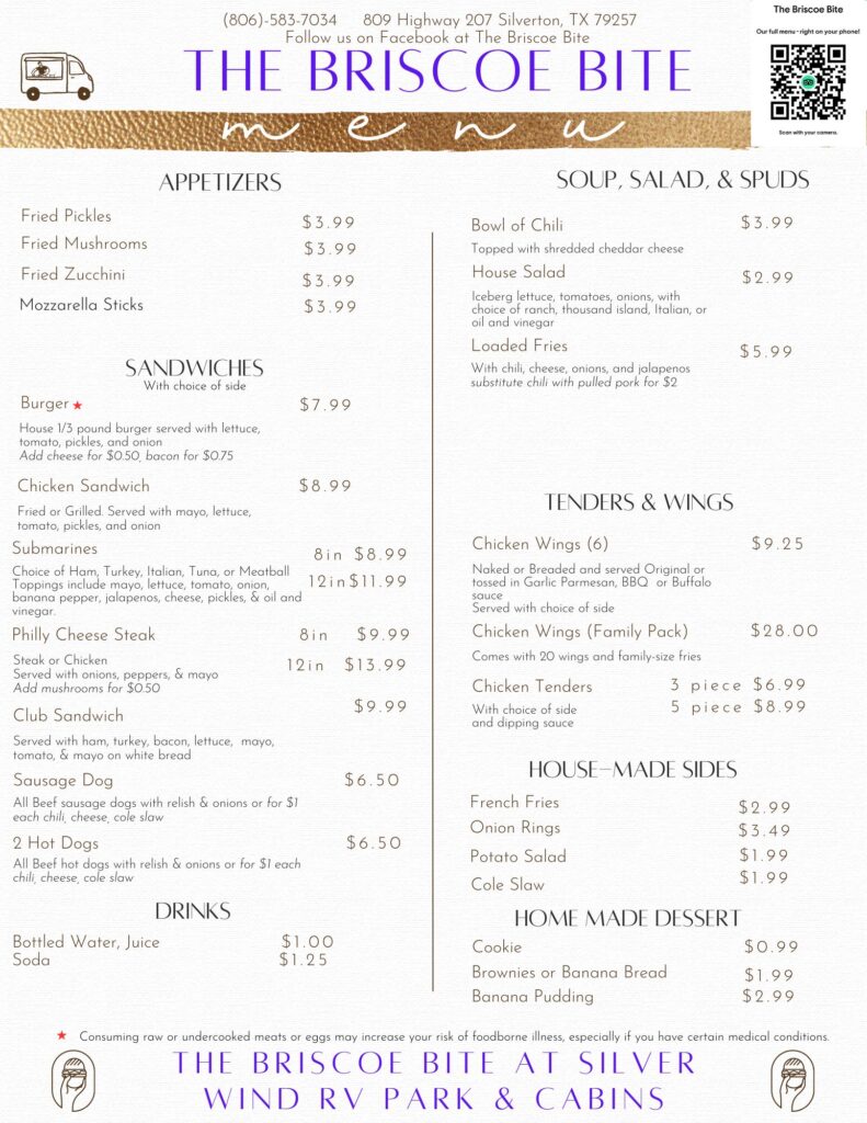 The on-site food truck at Silver Wind RV Park and Cabins, The Briscoe Bite, offers a delicious and convenient dining option for guests. Serving up breakfast, sandwiches, drinks, and desserts, the menu also includes pizzas, soups, salads, and house-made sides. For families, there’s even a kids’ menu. Whether you’re grabbing a quick bite or enjoying a relaxed meal at one of the picnic tables, The Briscoe Bite provides a variety of freshly prepared options to satisfy all tastes during your stay.